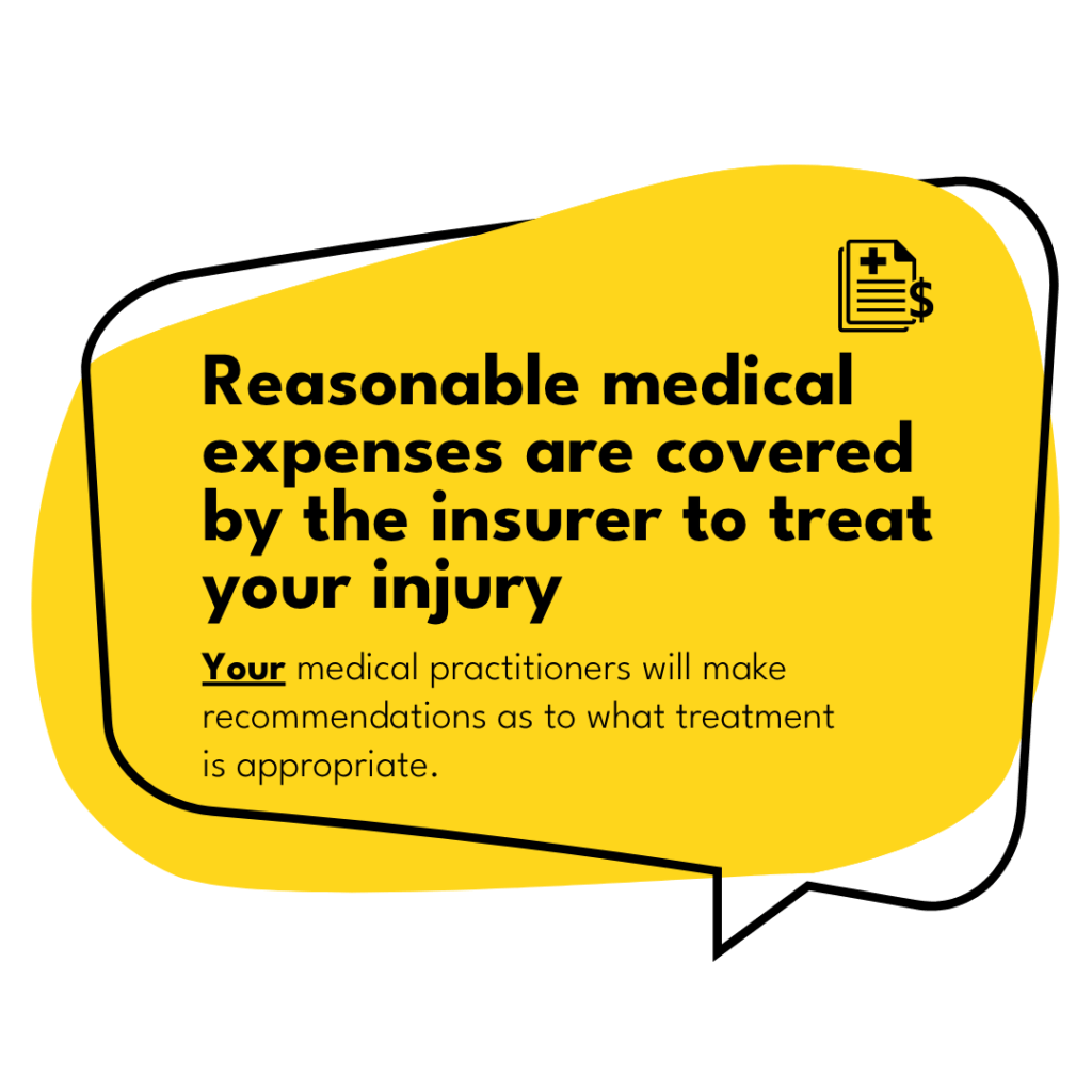 Costs associated with getting treatment, including medications, travel costs, and accommodation (where applicable) are also covered by the insurer. Keep your receipts and a log of any treatment related travel.