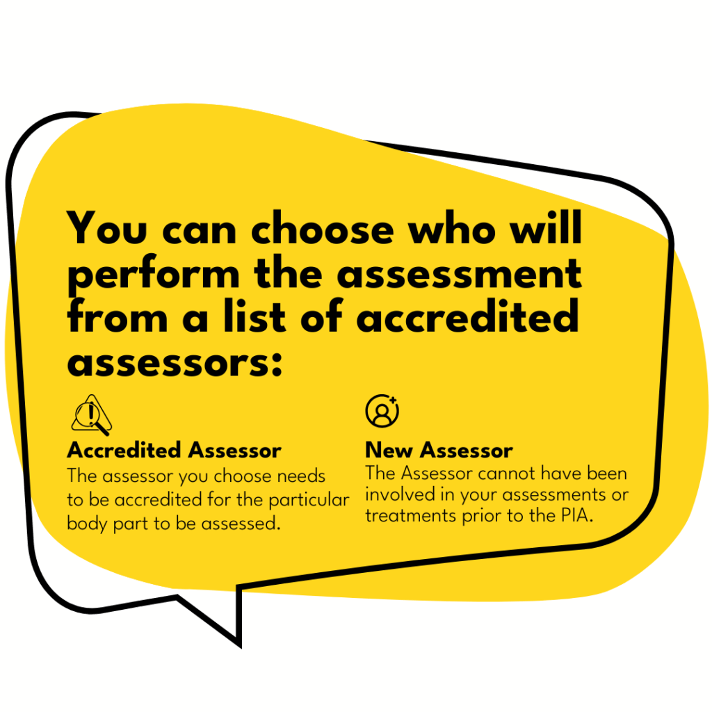 You can choose who will perform the assessment from a list of accredited assessors. The assessor you choose needs to be accredited for the particular body part to be assessed, and cannot have been involved in your assessments or treatments prior to the PIA.