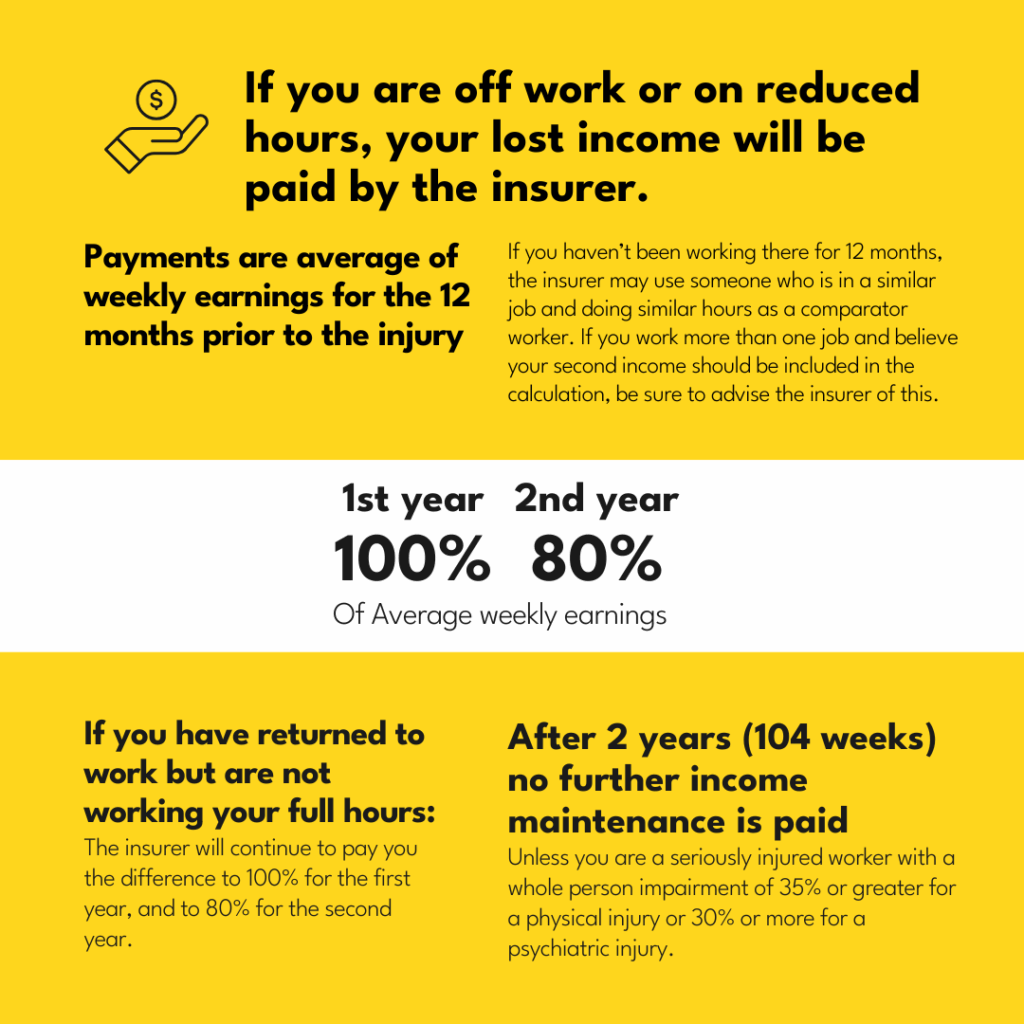 Income maintenance is paid at 100% of your average weekly earnings* for up to 52 weeks (1 year) following the date of injury, and at 80% for the next 52 weeks. After 104 weeks, no further income maintenance is paid unless you are a seriously injured worker with a whole person impairment of 35% or greater for a physical injury or 30% or more for a psychiatric injury.