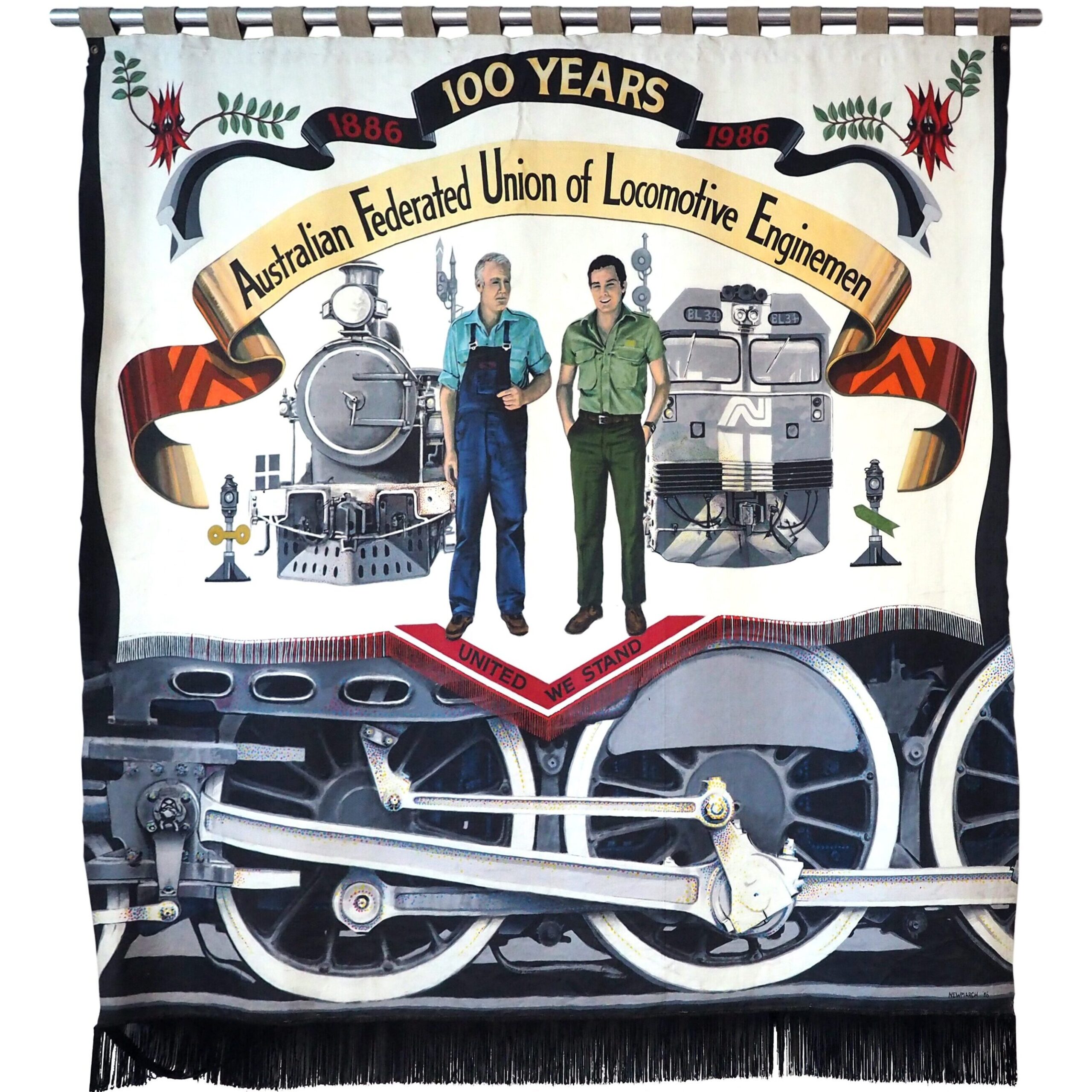 Then Secretary Rex Phillips stressed the banner’s symbolism: The two trains represent those of the era, the 1886 R/Rx Steam Locomotive and 1986 BL Diesel, as do the drivers. The train wheels and driving rods indicate the strength in the union as it strives to protect its members and to improve their working conditions.