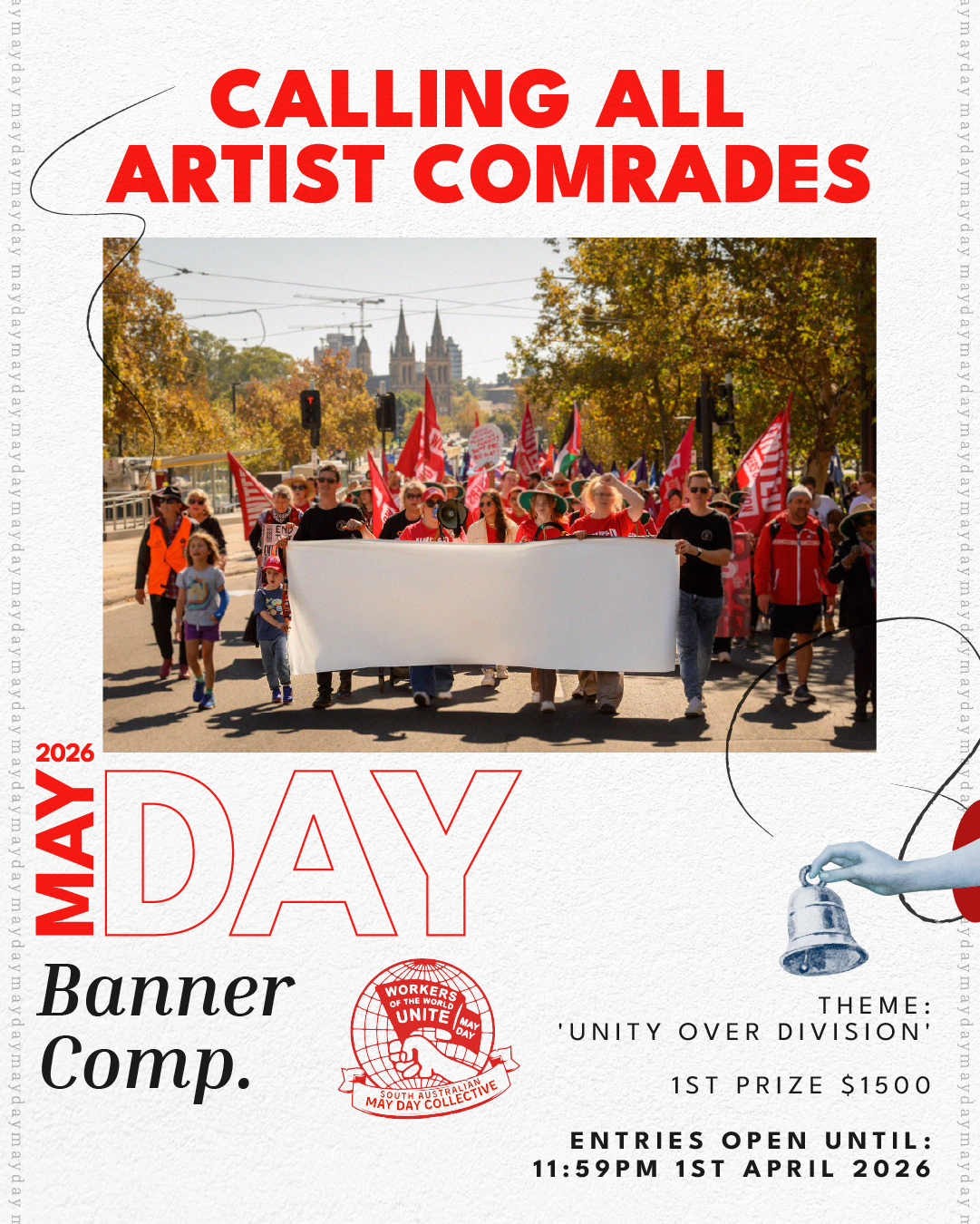 The SA May Day Collective is seeking a design for the lead walking banner of the 2026 May Day March. We need a banner that captures our power, our history, and our refusal to be divided.