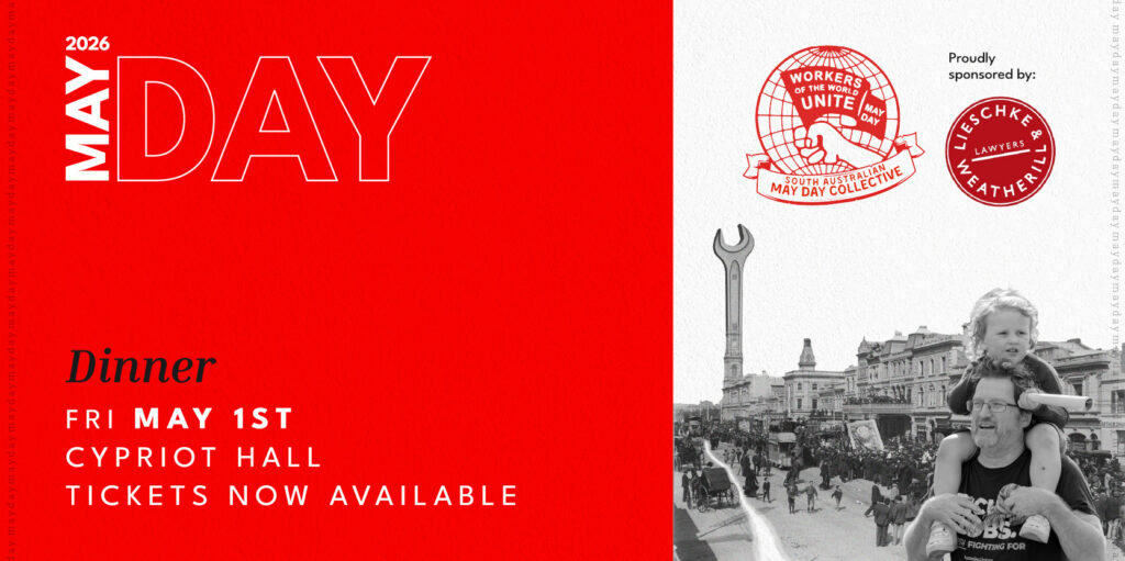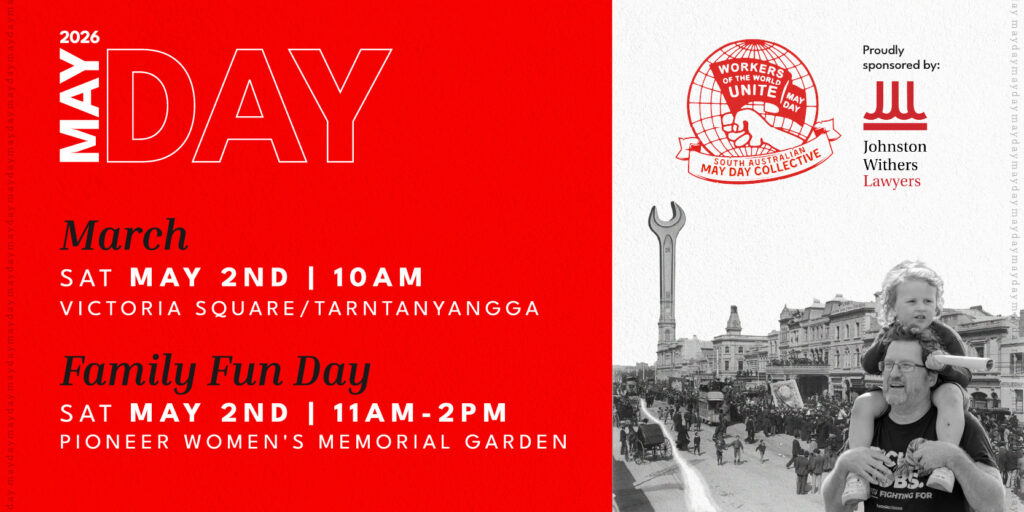 The May Day March will kick off at 10:00am at Victoria Square/Tarntanyangga. We will march up King William St to the Pioneer Women’s Memorial Garden, at the corner of King William Rd and Victoria Dr.